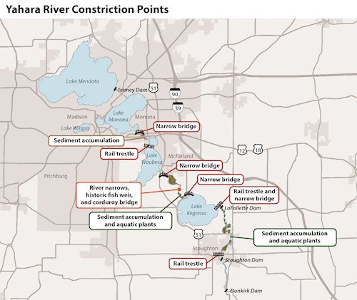 The Yahara River channel narrows or becomes shallower in several locations which slows down water flow. Examples of these constriction points include narrow bridges and shallow riverbeds due to layers of sediment accumulation from decades of erosion. Debris in the river, such as tree trunks and boulders, causes friction and slows water flow. In July 2018, 31 dump truck loads of debris (rock, pieces of metal, train parts, and trash) were removed from the river bed at the railroad trestle in Stoughton. The removal of debris increased water flow about 20%. Click to enlarge image.