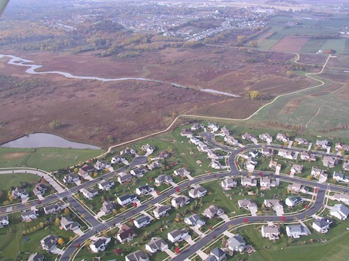 The watershed lost over 30% of its original wetlands in Dane County which reduces areas previously available for flood water storage. The photo shows wetlands in the Pheasant Branch Conservancy in Middleton which are surrounded by development.