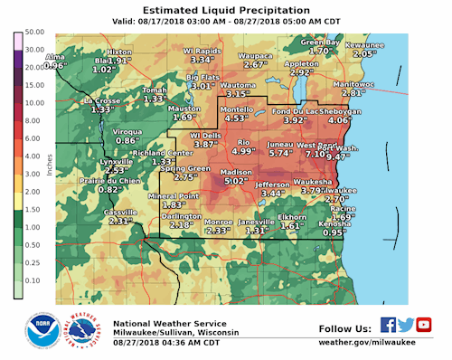 In May 2018, the Dane County Regional Airport (located in the Yahara River Watershed) received the second highest amount of rainfall on record. Despite all four lakes being at summer minimum at the beginning of the ‘summer’ season, all four lakes rose above their summer maximum levels with Kegonsa reaching a historic high in July. The flow from Tenney Dam was decreased to minimize flooding in Lake Kegonsa. In August, the watershed received higher than average amounts of rain causing waterlogged soils. This culminated in an intense rain event on August 20-21 with parts of the watershed receiving over 10 inches of rainfall. This was followed by many more rain events in August, September, and October.